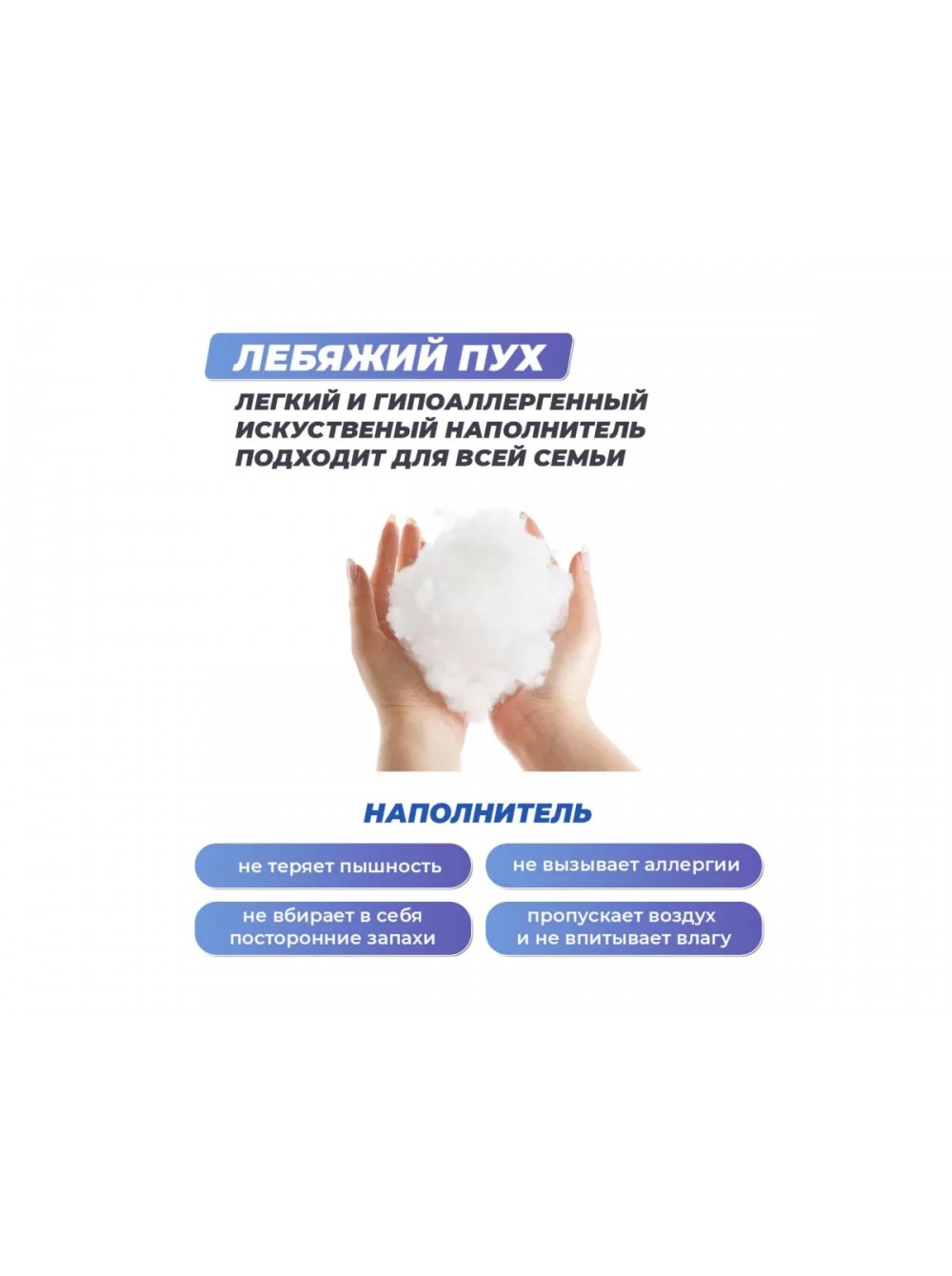 В наполнении подушки содержится искусственный лебяжий пух, который является гипоаллергенным материалом, не требует дополнительного ухода.